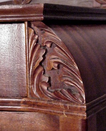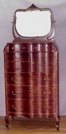 SERPENTINE FRONT MAHOGANY TALL CHEST WITH MIRROR: Shaped mirror over 2 half length drawers over mid section of drawers to the left, hat box to the right, over 3 full length drawers.
