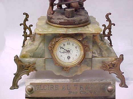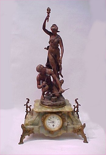 FRENCH FIGURAL MANTLE CLOCK: Green alabaster base surmounted by C. H. Levy bronzed metal statue ''Gloire Au Trevail''. Enameled porcelain dial. 31''h.