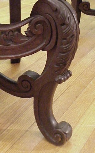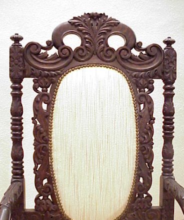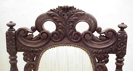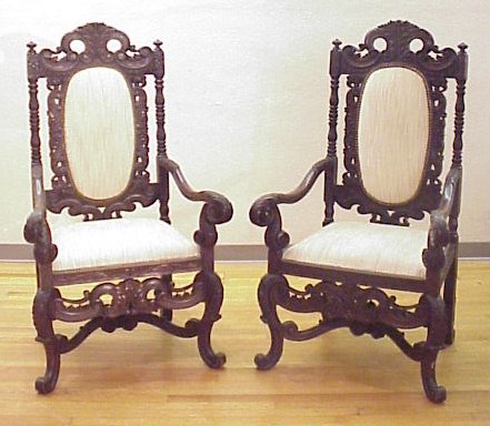 PAIR OF CARVED OAK THRONE CHAIRS: Carved throughout, oval upholstered back and seat. Scrolled hand holds, carved stretchers meet at center finial. 53''h, 29''w, 26'' deep.