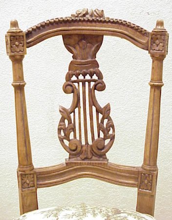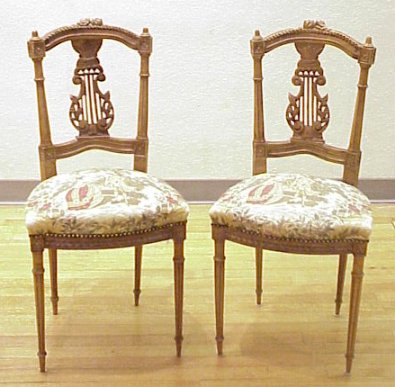 PAIR OF FRENCH LOUIS XVI SIDE CHAIRS: Slightly arched top rail, lyre form splat, straight reeded chairs. Please note leg is loose on one chair. 35 1/2''h, 15'' x 17''.