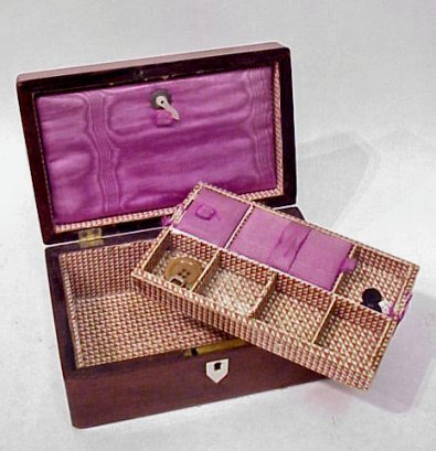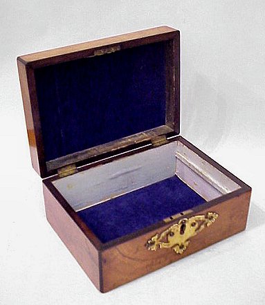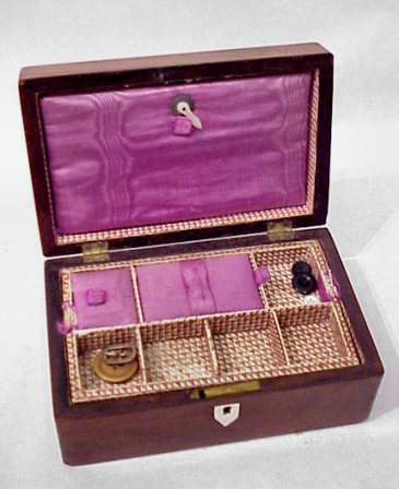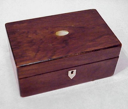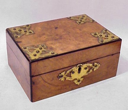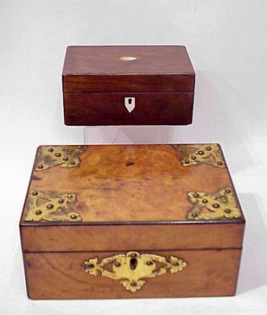 A COUPLE OF 19TH C ENGLISH BOXES: One being a rosewood sewing box, 3 3/4''h, x 8'' x 4 3/4''. The is a brass mounted burled wood box, 5''h, x 10 3/4'' x 7 1/2''.