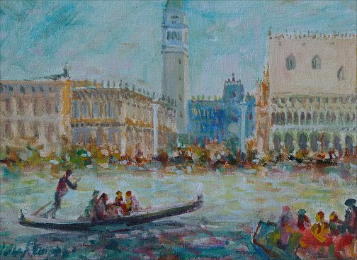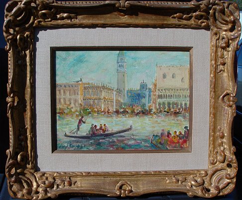 RAMPAZO, Luciano, (French, 1936-): ''Gondola To St. Marks'', O/C, 9'' x 12'', (16'' x 19'' w/frame), SLL, from Merrill Chase, encased in high quality contemporary gold gilt frame. Condition - Small tear in upper margin.