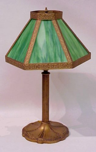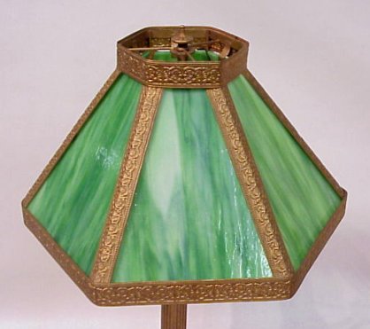 VINTAGE MILLER TABLE LAMP: Shade is 6 panels of green slag glass in embossed metal frame, 12 1/2'' dia. Repainted gold color iron base, 21''h. Bottom has raised letters ''ML Co 235''. Single switch socket.