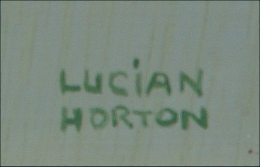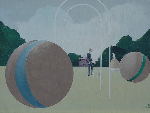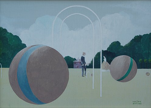HORTON, Lucian, (American, 20th C): Surreal landscape with croquet players, O/Wood Panel, 11 3/4'' x 16 1/2'', 18 1/2'' x 23'' with frame, signed lower right.