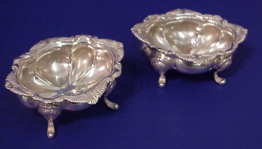 PAIR OF GORHAM STERLING MASTER SALTS: Footed, oval melon ribbed body, shell motif to slightly rolling rim. 2.89 oz each. 1 3/4''h x 4''