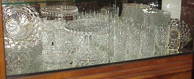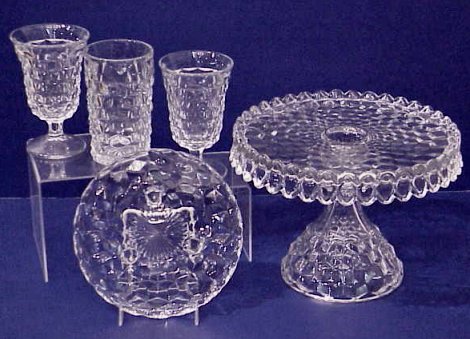 LARGE COLLECTION AMERICAN FOSTORIA GLASSWARE: Approx. 47 pieces to include pedestal cake stand, 12 tumblers, 5''h, 6 stems, 5 1/2''h, 19 plates, 7'' dia, 7 plates, 9 1/2'' dia., double handle sugar bowl, and a 7'' dia. bowl. Sold as a lot.