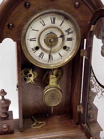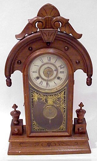 NEW HAVEN VICTORIAN WALNUT CLOCK: Walnut case shelf clock. Roman numeral dial, brass pendulum with dial. Reverse painted glass panel, Carved crest on arched top with drop finials. Partial New Haven paper label. 24''h. x 14''w. x 4''.
