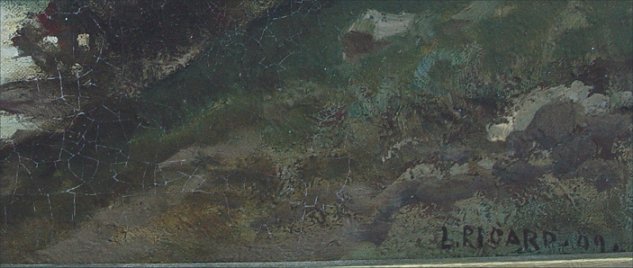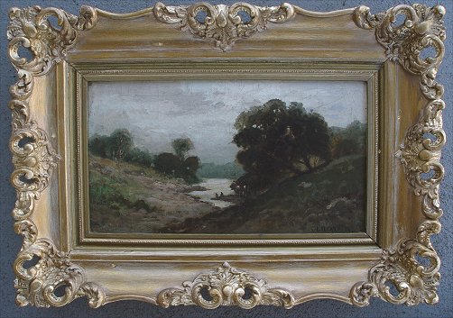 RICARD, L., (American, 19th C): Impressionist country landscape with fisherman, O/C, 9'' x 12'', encased in over painted carved frame, overall 16'' x 23''. Condition - Spotted in paint throughout midsection of painting.
