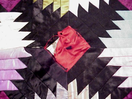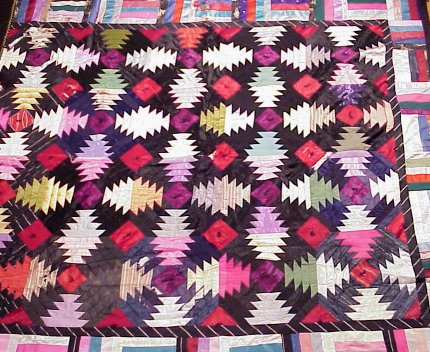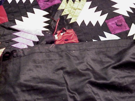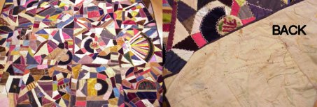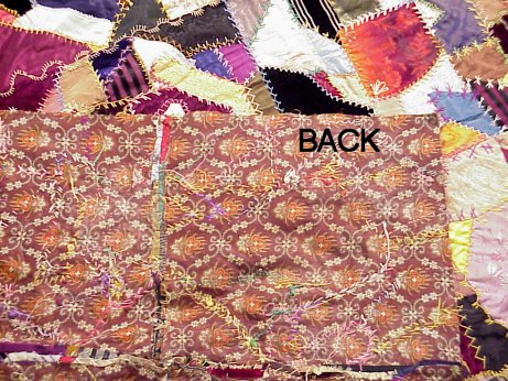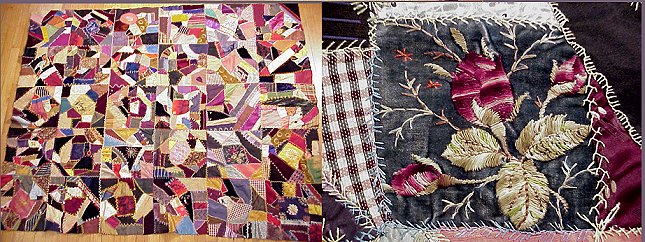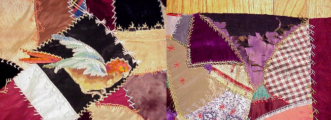 3 QUILTS, CRAZY AND PATCHWORK: All in rich jewel tone velvets and satins. 2 crazy quilts, the first has no binding, is 57'' x 70'', and has exquisite embroideries of birds and flowers. The second crazy quilt has embroidered monograms and quite a bit of wear. The third is a patch work quilt of predominately black with jewel tones, 77'' x 70''. Please note all three quilts do show wear.