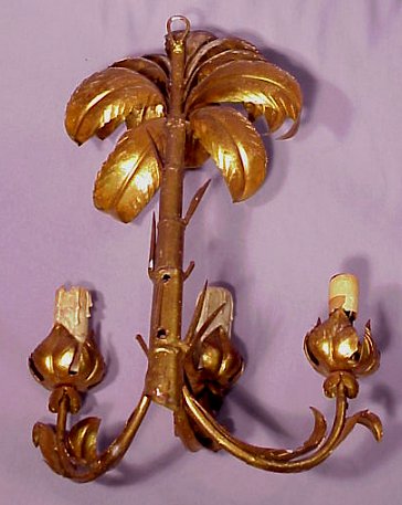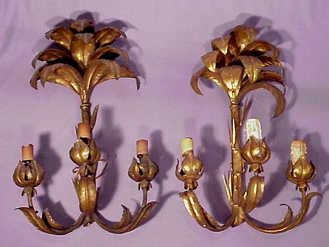 GILT METAL 3 LIGHT SCONCES: 3 light electric sconces in a foliate motif, approx. 24''h.