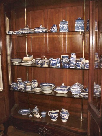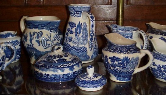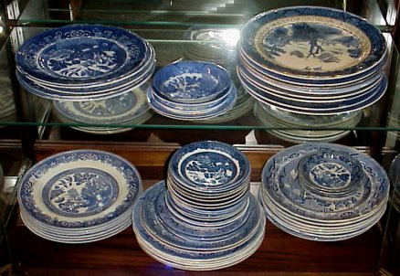 ENGLISH BLUE WILLOW DINNERWARE: A collector's accumulation of many years of approx. 57 pieces by Hanley, Fenton, Allerton, and Staffordshire to include 4 covered vegetables, 2 rectangular platters, round cake server, milk jugs, gravy, 29 dinner plates of various styles, open vegetable bowl and a Burgess & Leigh tea jar made exclusively for Twining.