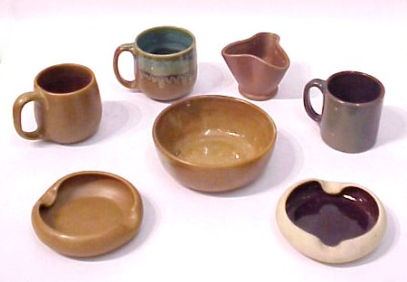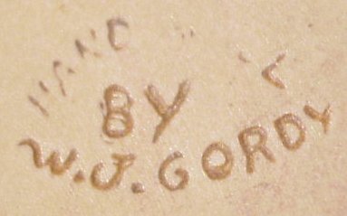 W.J. GORDY GEORGIA POTTERY COLLECTION: 7 pieces of hand made pottery by Wm. Gordy of Meriwether County Ga. Pieces to include a bowl, 5 1/2'' dia., 3 different mugs, and 2 ashtrays. Each of these are impressed ''Hand made by Wm.J Gordy''. The seventh pieces is crimp sided 3'' vase signed Georgia Art Pottery.