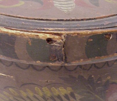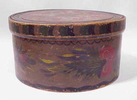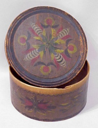 PENNSYLVANIA DUTCH TOLE DECORATED CHEESE BOX: Bentwood, 19th C, 10 1/4'' dia x 5 3/8''.