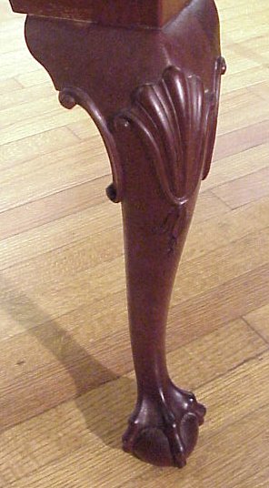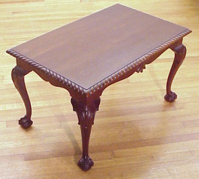 CARVED MAHOGANY CHIPPENDALE STYLE COFFEE TABLE: Earlier 20th C. Ball and claw foot with gadroon edging along the top. Carved knees, shaped skirt. 20''h. x 35'' x 22''. Hand made by master wood carver Alfred Roebelt. Roebelt's father was a master carver in Thuringa, (now a part of East Germany), then a world renown center for fine furniture crafting. Roebelt passed his masterpiece exam at the age of 17. Coming to America in 1930 he worked for H. Sack & Company in Massachusetts until retirement in 1971. Provenance: Roebelt Estate