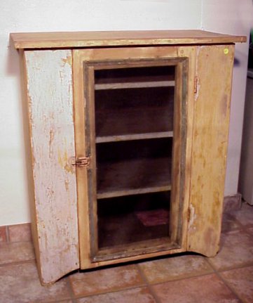 PRIMITIVE AMERICAN COUNTRY PIE SAFE: Remnants of green and blue paint on the front, screen panel in door. 4 shelf interior. 38''h x 16'' x 33''.