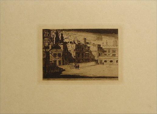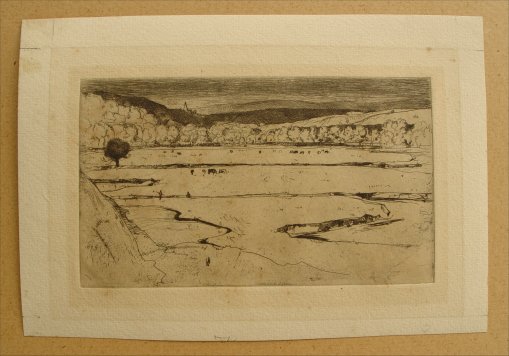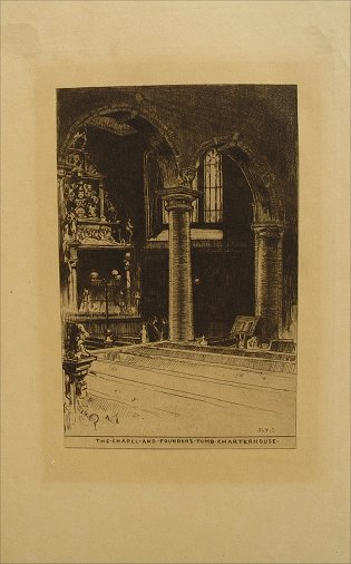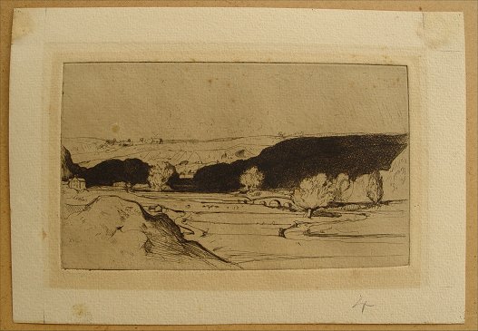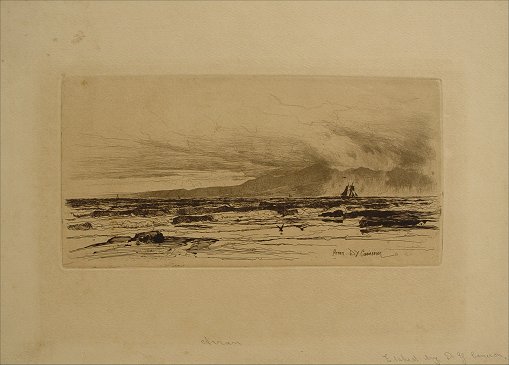 CAMERON, David Young (Sir), (British, 1865-1945): Lot of 5 etchings. To include, ''Arran'', 9 3/4'' x 14'', slight foxing and staining throughout. Two untitled landscapes, approx. 5 1/2'' x 8'' each. ''Upper Green Charterhouse Chapel in front and Cloisters to the right'', 9 1/8'' x 12 1/2''. And ''The Chapel and Founders Tomb Charterhouse'', 8 3/4'' x 5 1/2'', some yellowing and glue staining in upper left. Sold as a lot.