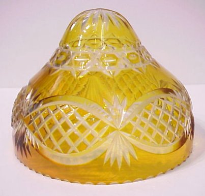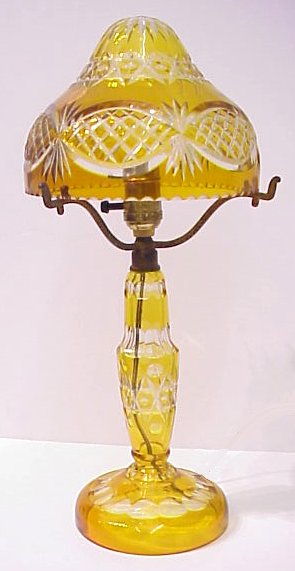 AMBER CUT TO CLEAR BOUDOIR LAMP: Bohemian glass lamp with bell shaped shade. 18''h, shade is 8'' dia.