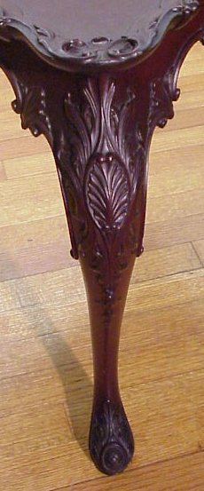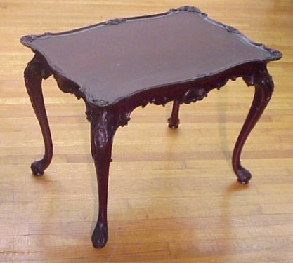 PHILADELPHIA STYLE CHIPPENDALE TABLE: Solid mahogany with shaped top. Carved acanthus leaves to knees and feet. Approx. 22''h x 28 1/2'' x 20''. Earlier 20th C. Hand made by master wood carver Alfred Roebelt. Roebelt's father was a master carver in Thuringa, (now a part of East Germany), then a world renown center for fine furniture crafting. Roebelt passed his masterpiece exam at the age of 17. Coming to America in 1930 he worked for H. Sack & Company in Massachusetts until retirement in 1971. Provenance: Roebelt Estate