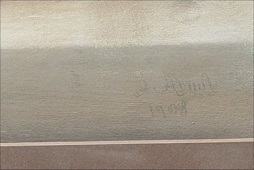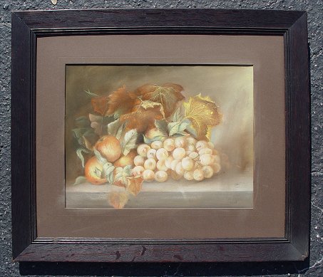 EARLY STILL LIFE OF FRUIT, GRAPES & LEAVES: Pastel, 12'' x 15 3/4'' sight size, signed lower right Arnold?, dated 1908, encased in period dark quarter sawn oak molding, overall 21 1/2'' x 25 1/4''. Condition - Several scuffs to piece in right margin, upper left margin and lower quadrant.