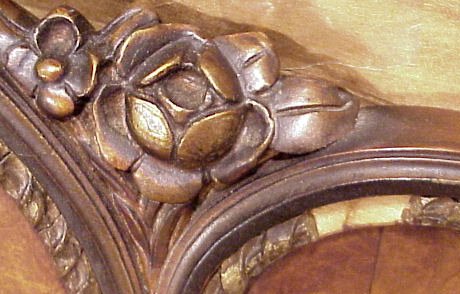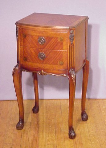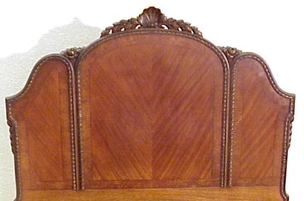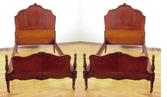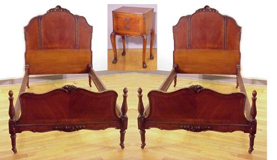 PAIR OF 1920'S FRENCH TWIN BEDS WITH NIGHT STAND: Pair of ornate French beds hold mattresses 73'' x 39'', screw type rails. Sold with an American French style 2 drawer stand by Glosson Artistic Furniture, of Cincinnati, Ohio. Ca. 1920's.