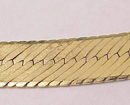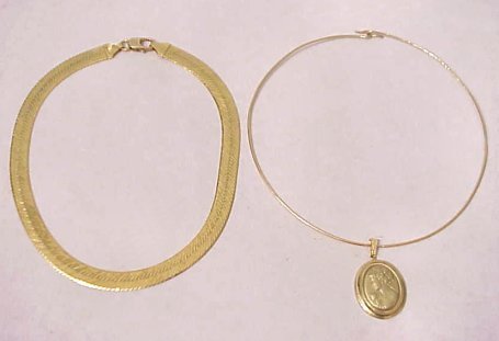 14K GOLD HERRINGBONE NECKLACE: Wide herringbone necklace, 16''l., marked ''14ktItaly''. Sold with an Italian nouveau style motif pendant, marked ''14kt Italy'', on a 14k (assayed) gold collar. Approx. 40 grams total.