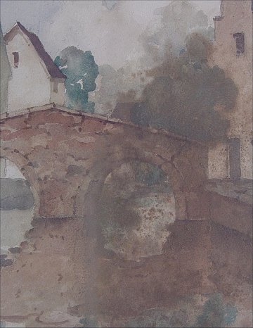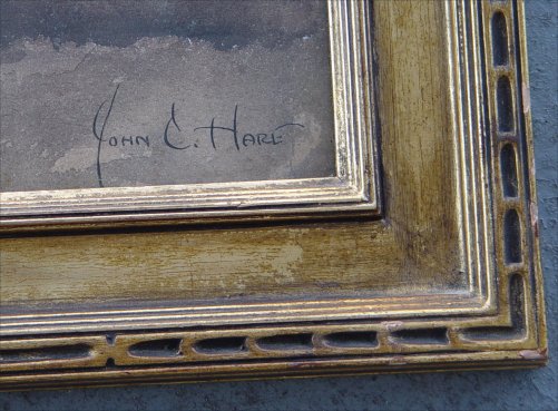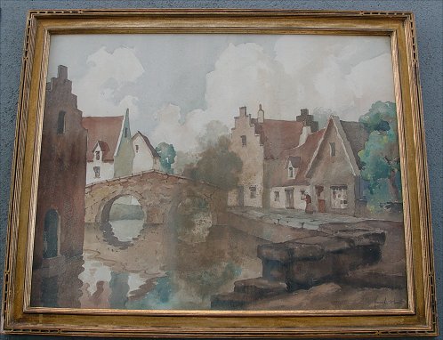 HARE, John C., (American, 20th C): Dutch canal scene, W/C, 21 3/4'' x 28'', signed lower right, -large stain in center, encased in 30's gilded impressionist frame with some wear, overall 25 1/2'' x 32''.