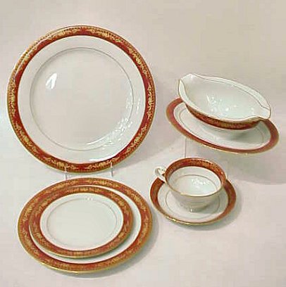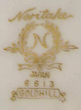 NORITAKE FINE CHINA IN THE GOLDHILL PATTERN: Hair short of a service for 12. 78 pieces to include 12 each of dinner plates, bread plates, low soup bowls, dessert bowls, cups and saucers. 11 salad plates, a large platter, medium platter, oval vegetable bowl, round vegetable bowl, covered sugar, creamer, and gravy with attached underplate.