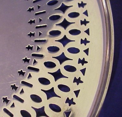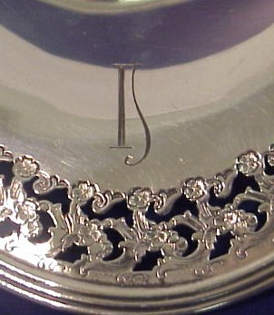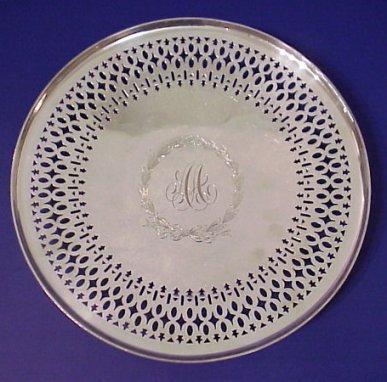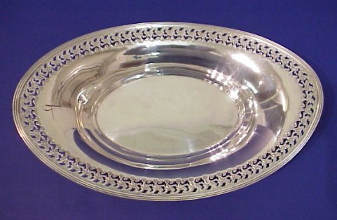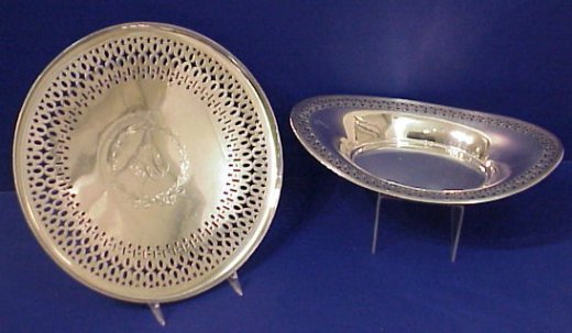 GORHAM AND WATROUS RETICULATED STERLING TRAYS: Watrous oval bowl with pierced floral rim, 11 3/4''l. Sold with a Ca. 1913 Gorham footed round tray with pierced border centering a wreath. Both pieces are monogrammed.