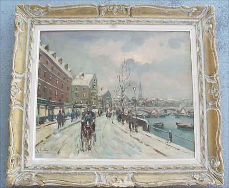 ROSELLI, A., (Italian, 20th C): Parisian street scene with Eiffel Tower in the distance, O/C, 20'' x 24'', signed lower left, encased in hand carved frame, overall 32 1/2'' x 37 1/2''. Condition - Tear in center and lower left corner with one patch visible verso, needs cleaning.