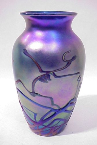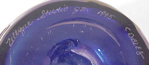 ZELLIQUE STUDIO CONTEMPORARY ART GLASS VASE: Iridised cobalt, signed ''Zellique Studio J.M. 1995 CDBLE8'' 10''h.