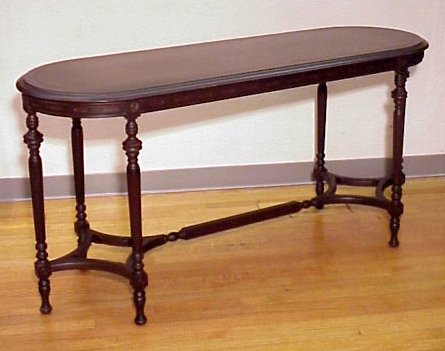 MAHOGANY SOFA TABLE: Oval top, 59'' x 20'', on 6 reeded and turned legs. Ca. 1920-30's.