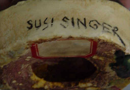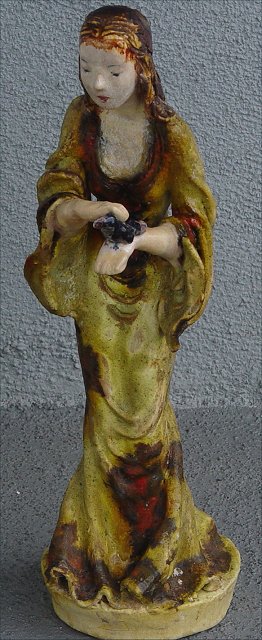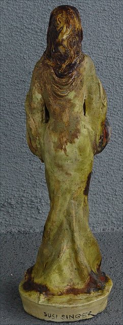 SINGER, Susi, (Austrian, 20th C): Figural sculpture of a young woman holding a bird, ceramic, 13 1/2'', signed on base with old label on bottom. Some firing flaws/cracks visible when looking up through the piece from the bottom.