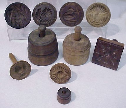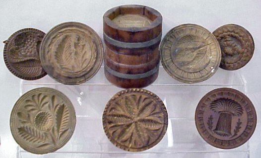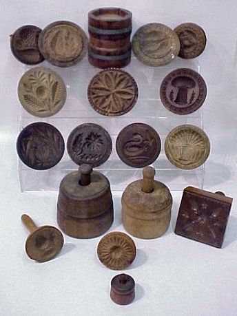 COLLECTION OF 18 EARLY CARVED BUTTER MOLDS AND PRESSES: Chance of a lifetime to acquire a collection of this caliber. There is an American eagle, Cow, Wheat Sheath, Thistle, Floral Medallions, Star, Swan, Starflower, Acorn. From 1 1/2'' to 4 1/2'' dia.