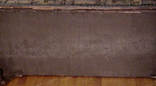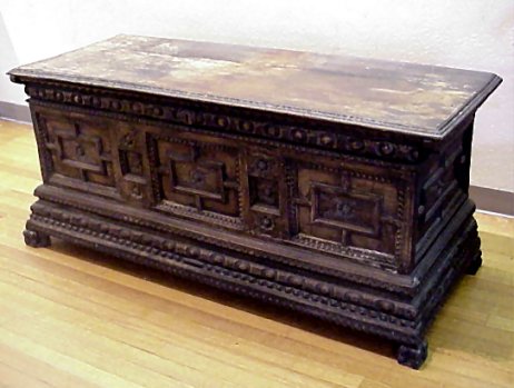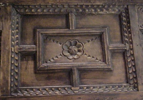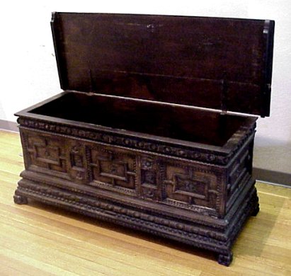 18th C CARVED BLANKET CHEST: Overhanging cover, rough hewn single back board. Carving on three sides. Approx. 56'' x 21'' x 24 1/2''h.