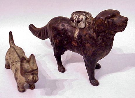 2 CAST IRON PENNY STILL BANKS SCOTTIE DOG AND WATER SPANIEL: ''I Hear a Call'' Spaniel with a pack on his back, 5 1/2''h x 8''l. Also standing Scottie dog with alligatored remains of white paint, 3 1/4'' x 4 1/2''.