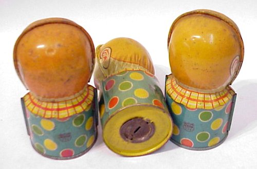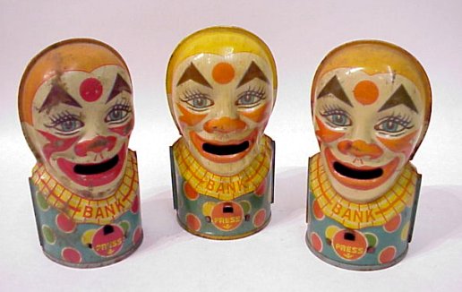 TRIO OF J. CHEIN CLOWN BANKS: Press the tab on two and they stick their tongue out at you, the third one is missing his tab. Generally good condition, the third without the tongue tab has the most paint loss. 5''h.