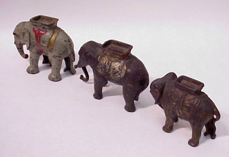 SERIES OF 3 PENNY CAST IRON STILL BANKS- ELEPHANTS WITH HOWDAHS: 3 1/4'' - 3 3/4''H. The largest is gray and red with some paint loss. The middle size has silver remnants on his blanket, the smallest has slight remains of a goldtone finish. They all have star decoration on the blankets, the 2 smaller have crescent moon and star.