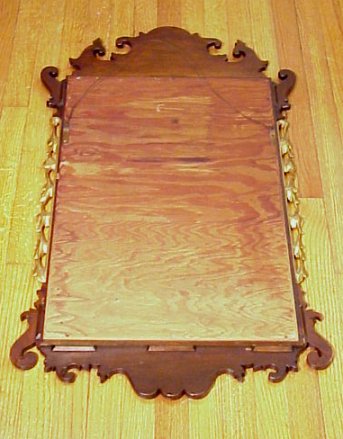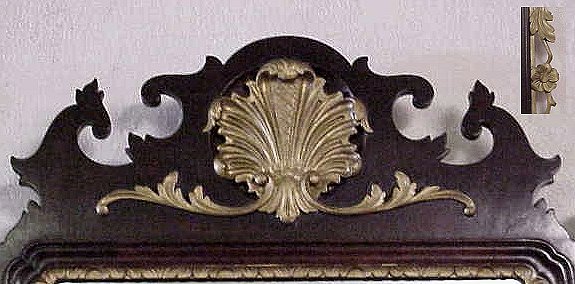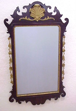 CARVED MAHOGANY FRAMED MIRROR: Finely crafted carved mahogany mirror with gilt shell at the crest and figs and flowers along the sides. Approx. 38'' x 23''. Hand made by master wood carver Alfred Roebelt. Roebelt's father was a master carver in Thuringa, (now a part of East Germany), then a world renown center for fine furniture crafting. Roebelt passed his masterpiece exam at the age of 17. Coming to America in 1930 he worked for H. Sack & Company in Massachusetts until retirement in 1971. Provenance: Roebelt Estate