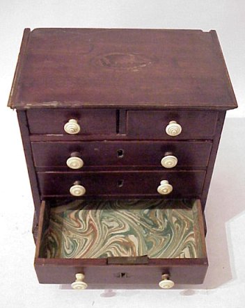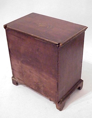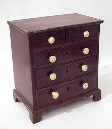 PERIOD MINIATURE VERSION OF A FEDERAL CHEST: 2 over 3 drawer chest on bracket feet, applied molding, turned bone ? pulls. 8''h, x 7 1/2''w. Has had some repair work done.
