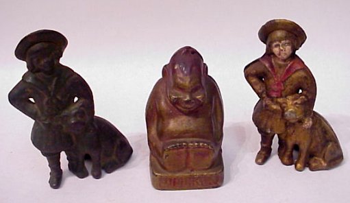 CAST IRON PENNY STILL BANKS BILLIKEN AND BUSTER BROWN & TIGE: 2 Buster Brown by A.C. Williams, one with green paint variation, the other gold and red, 5 1/8''h. These two rare banks are sold with Billiken 4 1/4''h.