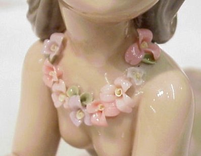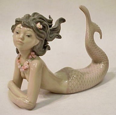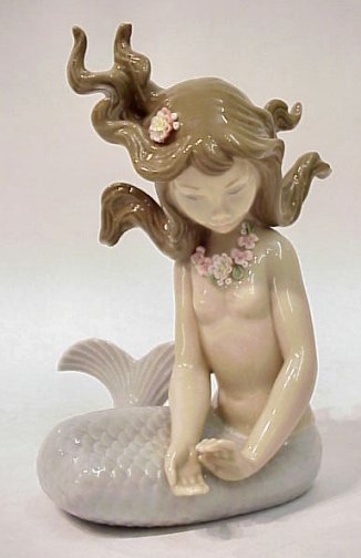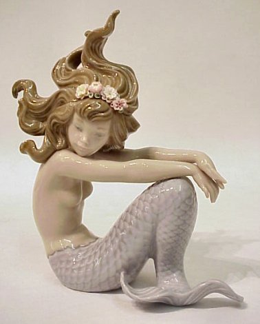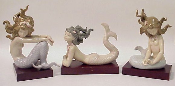 TRIO OF LLADRO FANTASY MERMAIDS: Three bathing beauties with flowing hair. ''Illusion'', 1413. ''Fantasy'', 1414. ''Mirage'', 1415. Each with a wood platform. Please note loss of flower to Fantasy. No chips, cracks, or repairs.