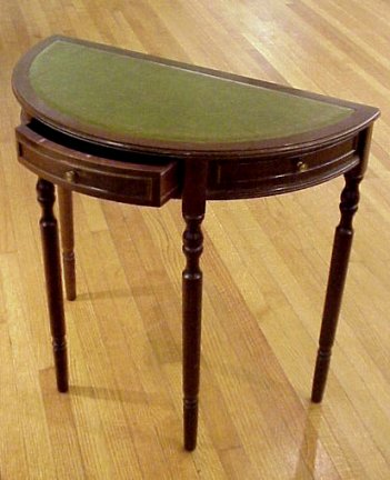 SHERATON STYLE HALF ROUND HALL TABLE: Walnut case with one drawer frieze half round top with gold gilt leather insert. Two faux drawers to sides. 28''h. x 30''w. x 15''d.