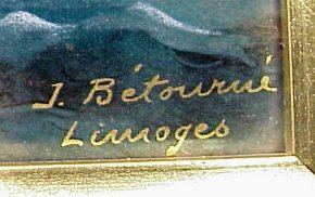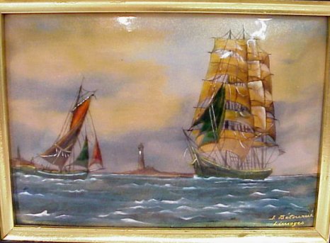 FINE BETOURNE' FRENCH ENAMELED PLAQUE: 20th C. enamel on copper depicting maritime scene set in a black lacquer and gilt frame. The plaque is 4'' x 5 1/8''. Framed 10'' x 12'' overall.