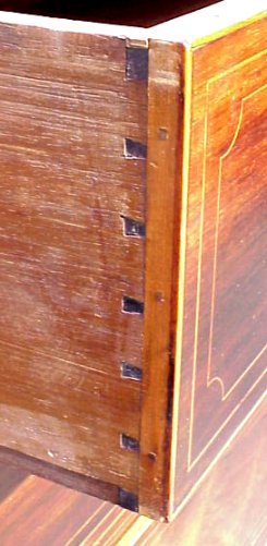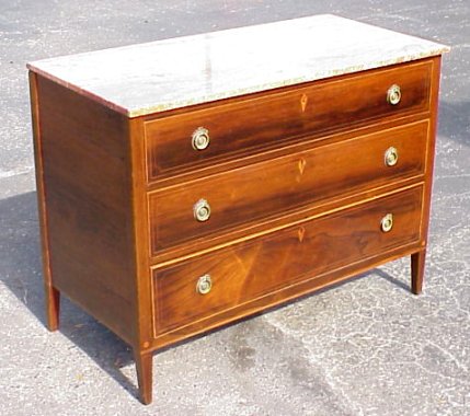 ROSEWOOD MARBLE TOP INLAID COMMODE, CA 1800: 3 drawer chest, string inlay. Deep red marble. Approx. 36''h., 48''w x 24''.