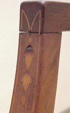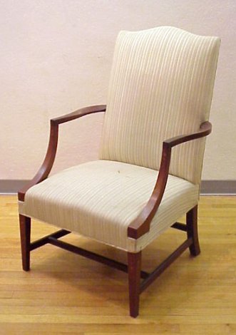 INLAID HEPPLEWHITE OR CHIPPENDALE STYLE CHAIR: Upholstered back and seat, open arm chair. Straight front legs have the same inlaid bellflower as the arms. Approx. 43'' x 26'' x 24''. Alfred Roebelt estate.