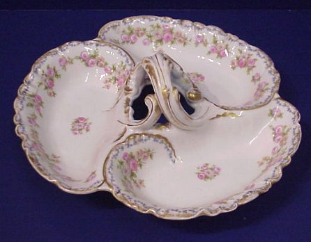 FINE FRENCH LIMOGES DIVIDED DISH: Ca. 1900- 1941. Three section dish with delicate rose decor. Scrolled gilt enhanced center handle. Gerard, Dufraisseix, and Abbott. 11 1/2'' dia. No chips, cracks, or repairs.