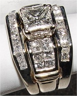 TREMENDOUS 3ctw LADY'S DIAMOND RING: Center stone of 1.01ct (weighed) Princess cut, purported H VS1, set in 14k white gold mount, 12grams, with 30 invisible set Princess cut diamonds, totaling an additional 2ctw, purported G VS. Yellow gold accent bars to shoulders, marked 14k, 4/4, Wh 14kt.