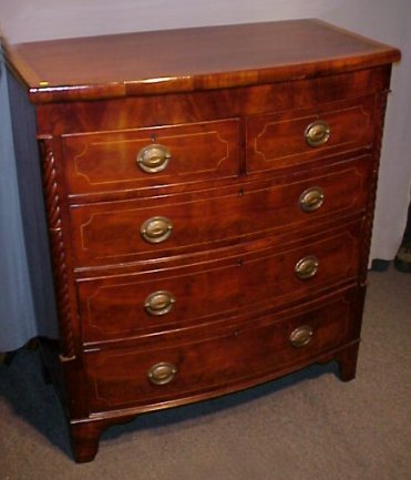 19th C. BOW FRONT, STRING INLAY, MAHOGANY CHEST OF DRAWERS: Featuring spiral carved stiles, banded top, bracket feet. 2 drawers over 3 drawers. Approx. 46''h., 41''w, 20 1/2''deep.