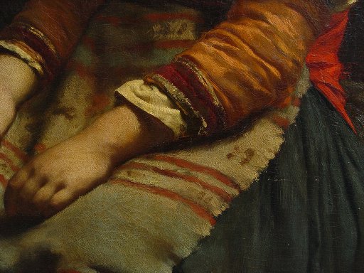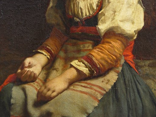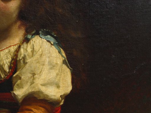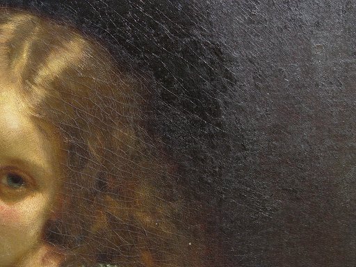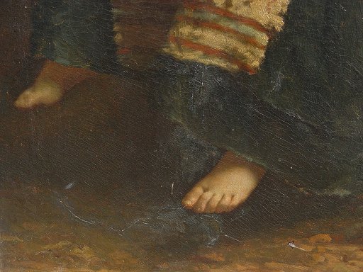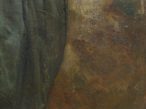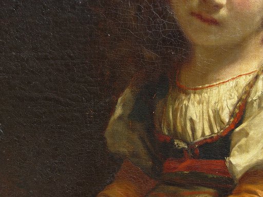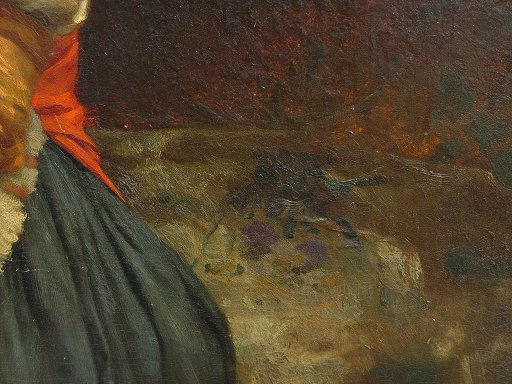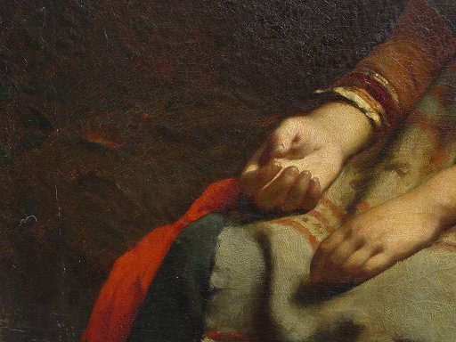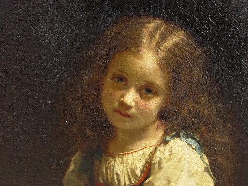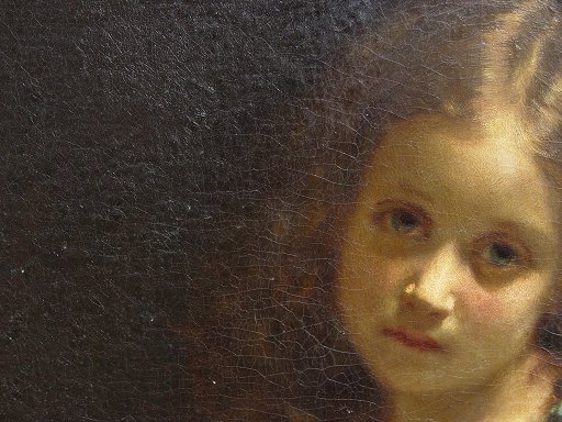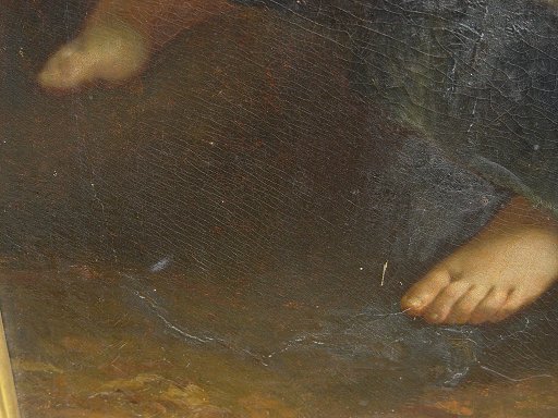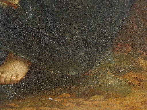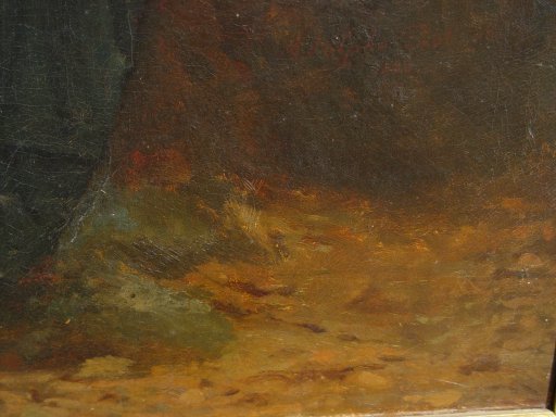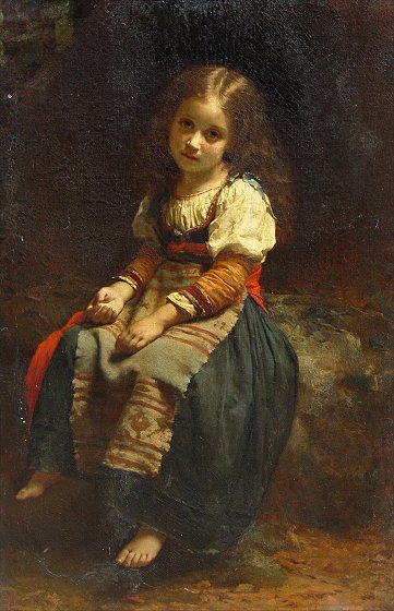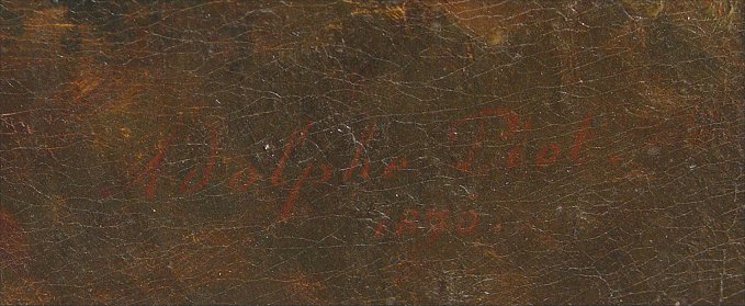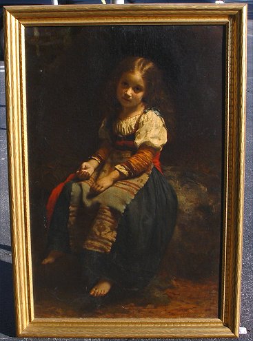 PIOT, Adolphe Etienne, (French, 1850-1910): Young peasant girl seated on a large stone in a forest clearing, O/C, 46'' x 30 1/4'', signed lower right, dated 1870?, encased in gilded molding, not of the period, overall measurements with frame 52'' x 36''. Condition - This painting has been re-lined with some spots of in-painting bordering the girl, and several darker areas visible upon black lighting, possibly inpaint in lower dress, difficult to tell as a result of the old varnish, will require a new lining, cleaning and probably some minor inpaint to make perfect, several small chips of paint loss in the lower left margin. Museum/Investment Quality. Call for any clarification on condition.