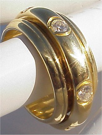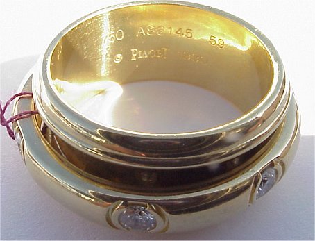 PIAGET ''POSSESSION'' RING: 18K yellow gold ring on a ring, outer revolving ring bezel set with 7 diamonds, approx. 1ctw, 18grams, marked to edge of inner band with two touch marks, and inside ''750 A86145 59'', copyright PIAGET 1990, size 10. Advertised by Piaget as ''Two rings that are free yet united, a symbol of love and faithfulness.''